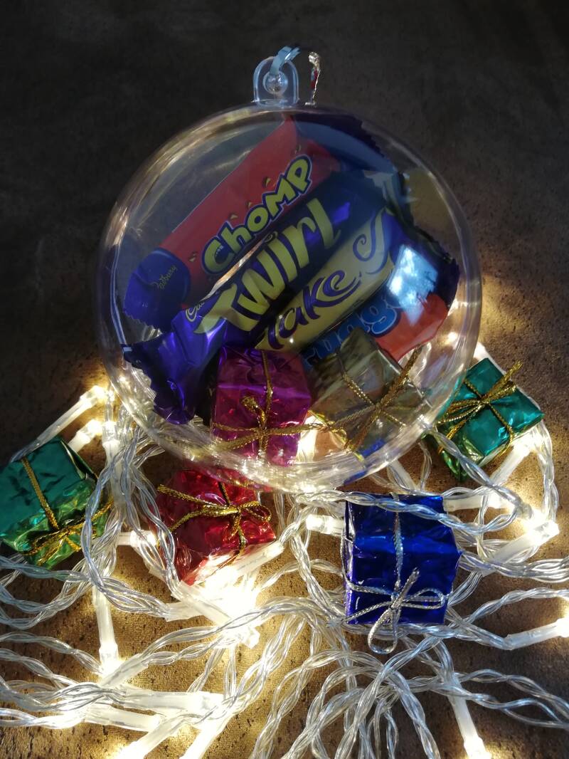 I bought a bag of miniature chocolate bars, there are four in this Bauble but you could really fill it up with quite a few more. You could put any chocolate in them including truffles, fudge or even liquors.